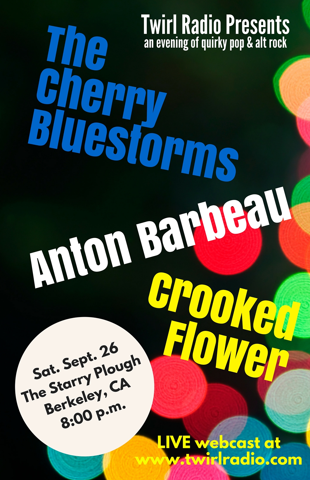 Twirl Radio Presents 9-26-2015Coming soon: our first live Twirl Radio Presents show in over a year! And we’re back with a vengeance. The Starry Plough in Berkeley, CA is going to be rockin’ hard with L.A.’s The Cherry Bluestorms, the legendary Anton Barbeau, visiting from Sacramento by way of Germany, and hometown East Bay rockers Crooked Flower.